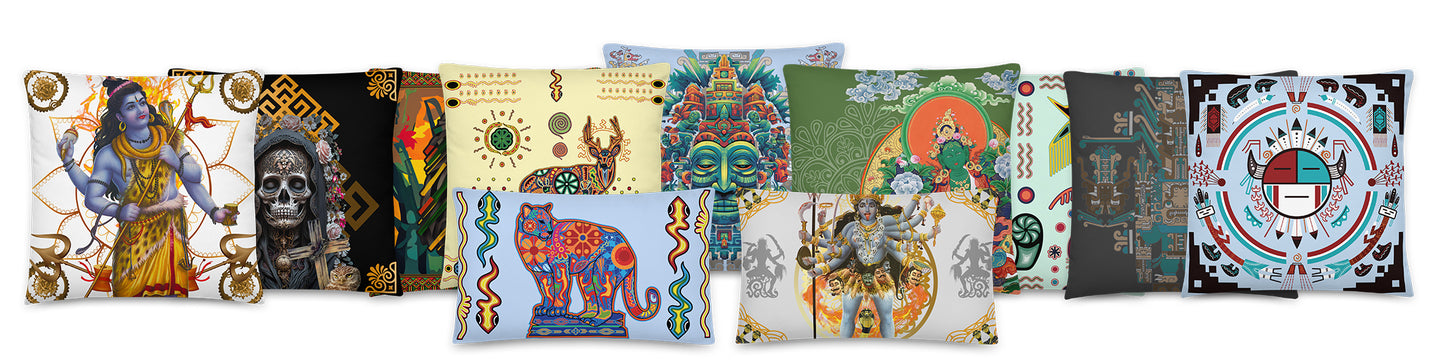 Each pillow features symbols and motifs that invite serenity and connection into your home, creating a sacred and comforting atmosphere.
